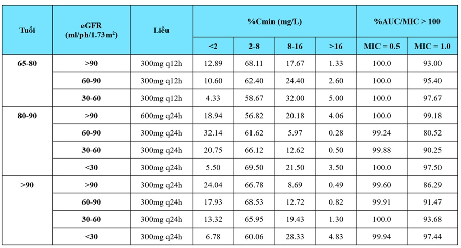 Tuổi tác và chức năng thận ảnh hưởng đáng kể đến nồng độ thuốc trong cơ thể, do đó việc cá thể hóa liều dùng trở nên cần thiết. Theo kết quả mô phỏng PK/PD của Liu và cộng sự (2025), đối với nhóm người bệnh từ 65–80 tuổi, liều dùng tối ưu được khuyến nghị là 300 mg mỗi 12 giờ vẫn đạt đích AUC và Cmin trên hầu hết các nhóm chức năng thận nhưng giảm được nguy cơ giảm tiểu cầu do có nồng độ đáy thấp hơn so với liều 600mg mỗi 12 giờ. Do đó, việc điều chỉnh liều ở đối tượng này có tiềm năng giúp cải thiện hiệu quả và độ an toàn, giảm nguy cơ gặp tác dụng bất lợi và đảm bảo kết quả điều trị tốt hơn.