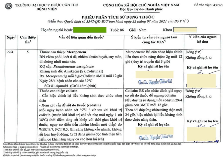 Đặt vấn đề: có thể người bệnh đang sốt do thuốc, cụ thể là do Colistin (một trong các thuốc có nguy cơ gây sốt do phản ứng quá mẫn hoặc độc tính trực tiếp). Dược sĩ tư vấn cho bác sĩ điều trị xem xét đánh giá lại nguyên nhân sốt, xem xét ngừng Colistin nếu không còn chỉ định thiết yếu, đồng thời theo dõi đáp ứng chức năng thận và điều chỉnh liều theo diễn tiến lâm sàng. Thực tế, người bệnh có giảm mức độ và tần suất các đợt sốt trong ngày sau khi ngưng colistin.