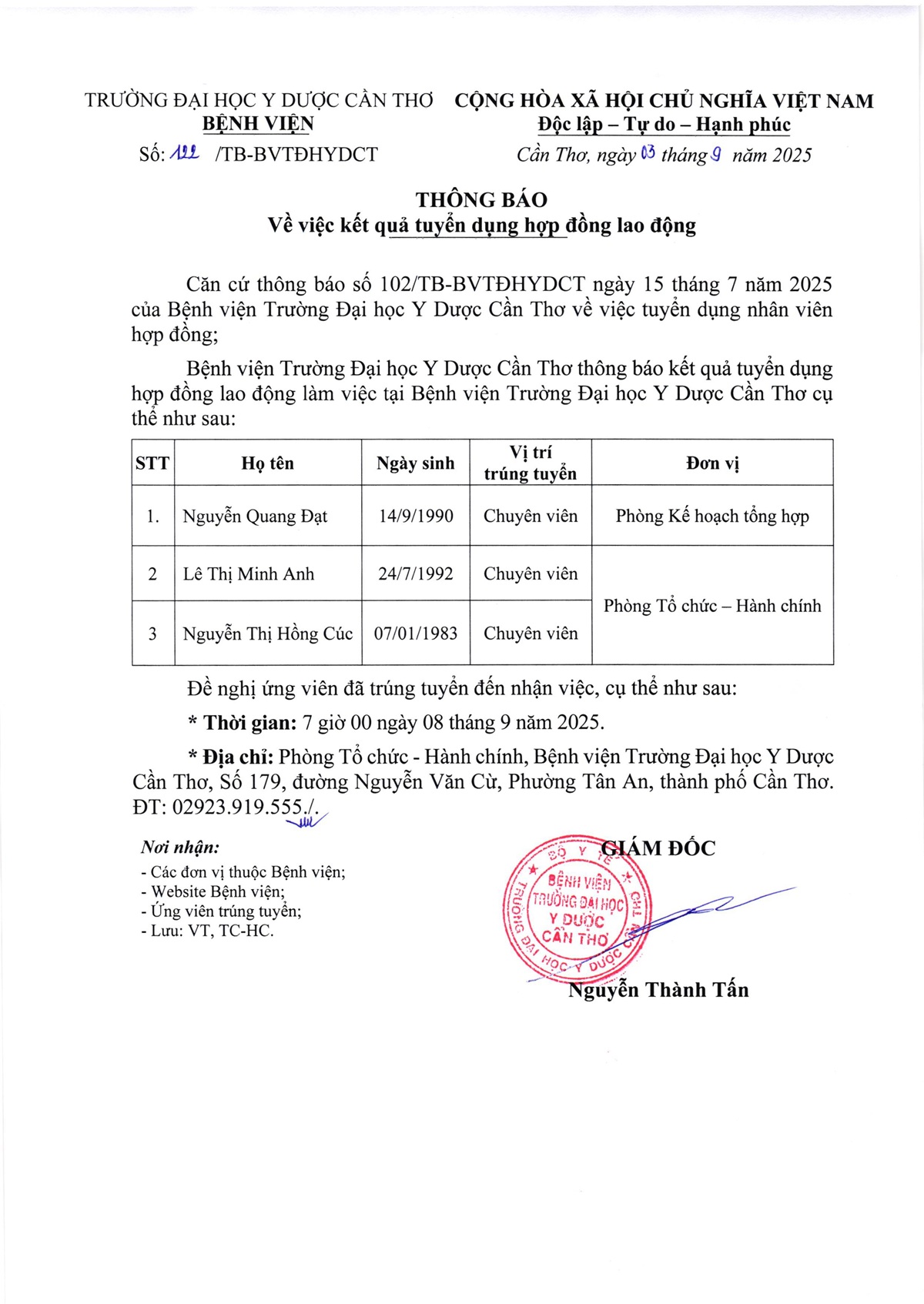 Thông báo số 142 về Kết quả tuyển viên chức năm 2025 của Bệnh viện Trường Đại học Y Dược Cần Thơ