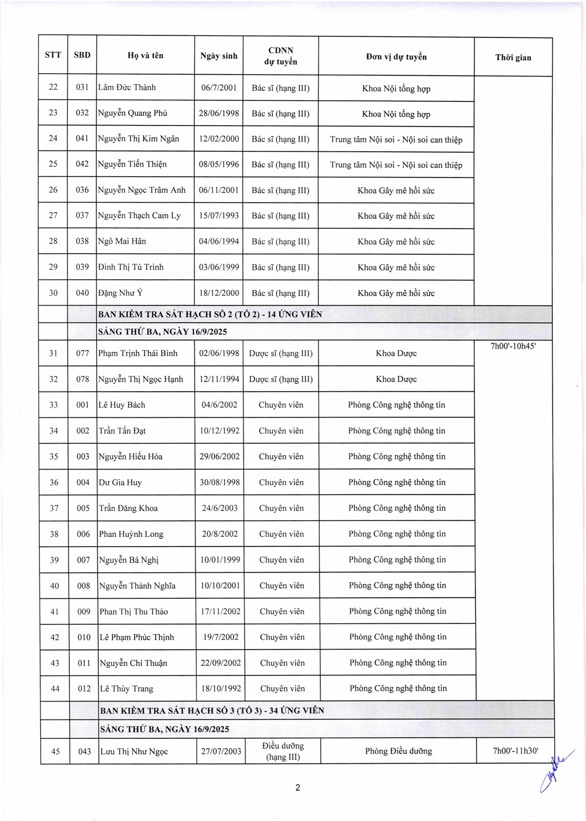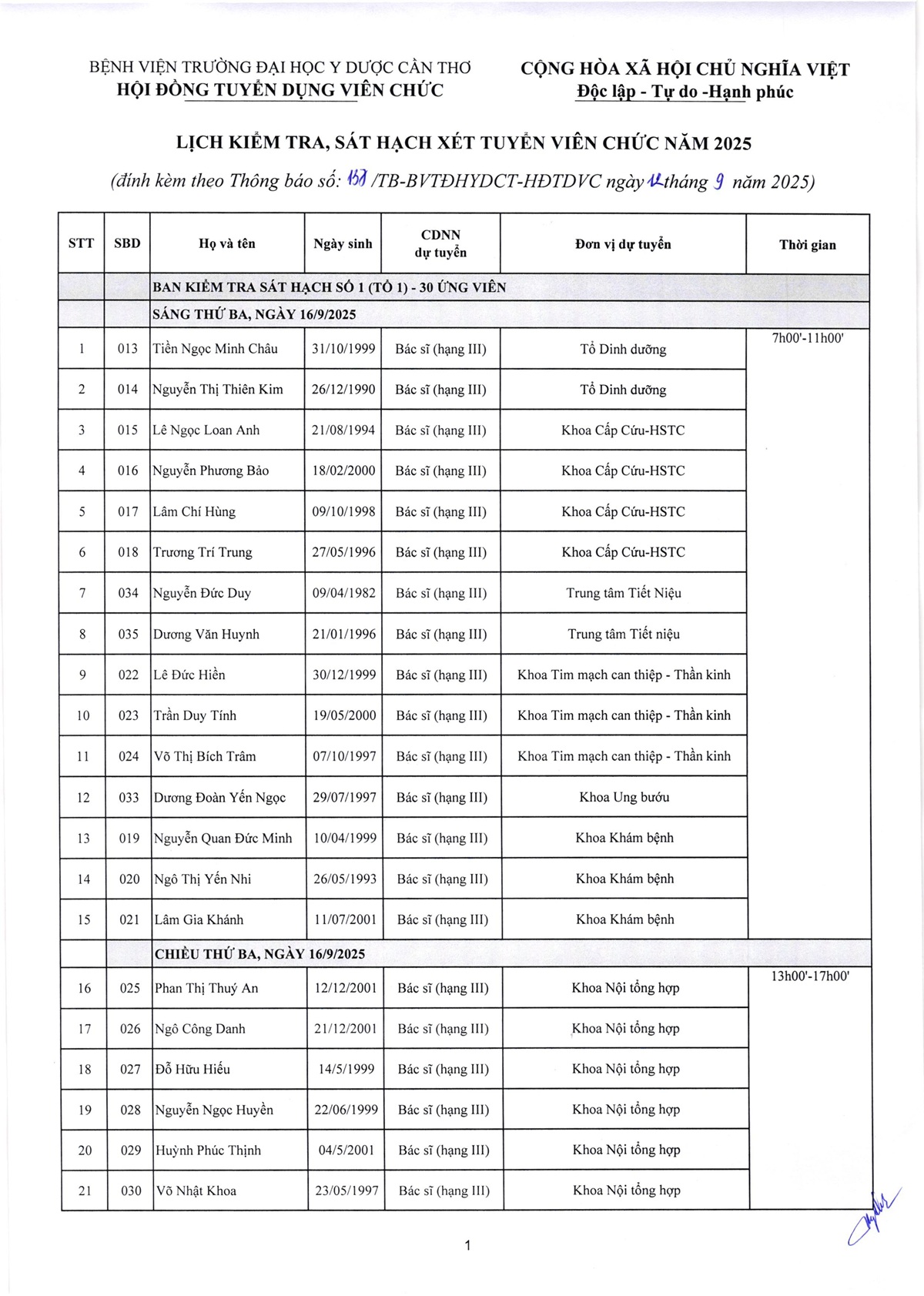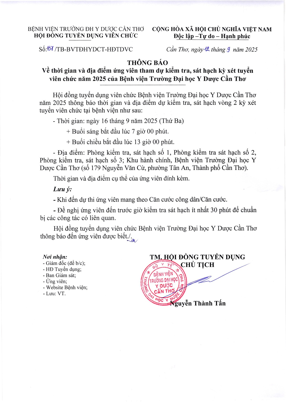 Thông báo số 137 về thời gian và địa điểm ứng viên tham dự kiểm tra, sát hạch kỳ xét tuyển viên chức năm 2025 của Bệnh viện Trường Đại học Y Dược Cần Thơ