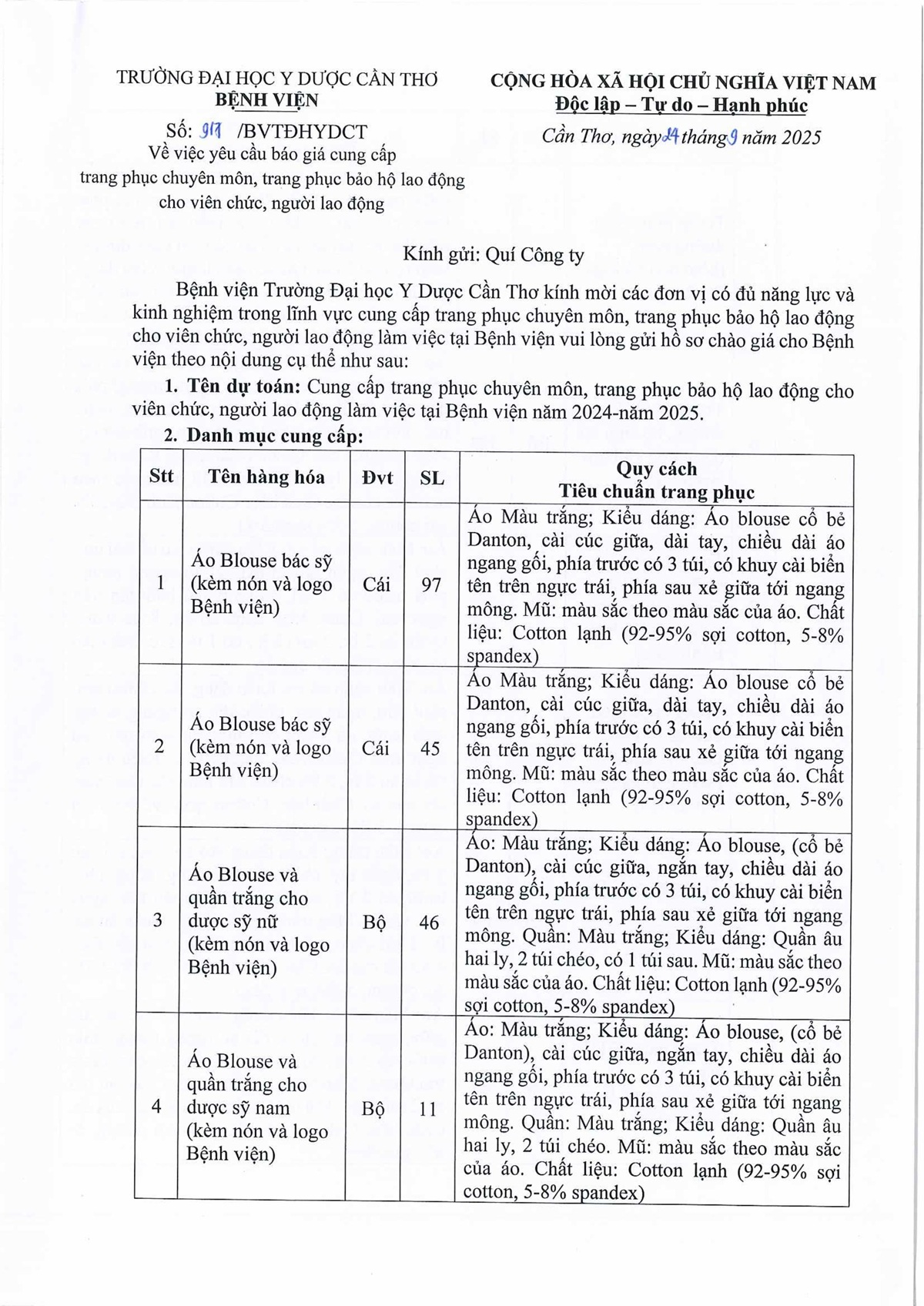 Về việc yêu cầu báo giá cung cấp trang phục chuyên môn, trang phục bảo hộ lao động cho viên chức, người lao động làm việc tại Bệnh viện.