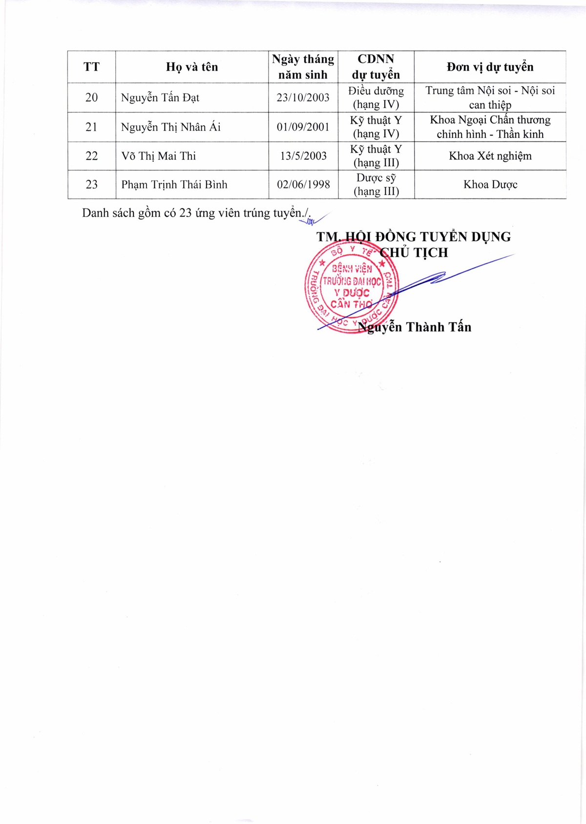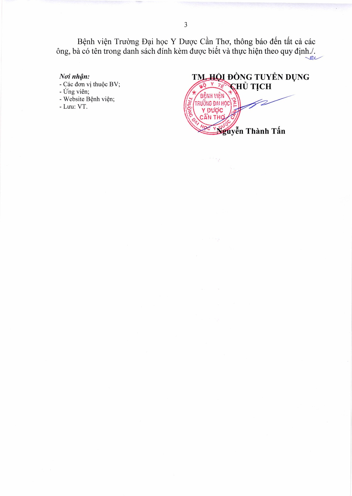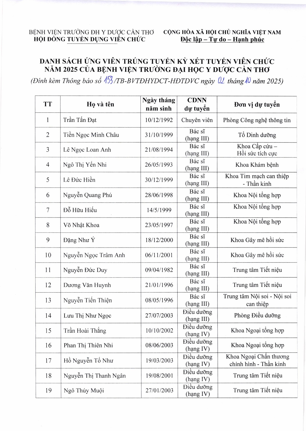 Thông báo số 153 công nhận kết quả trúng tuyển kỳ xét tuyển viên chức năm 2025 của Bệnh viện Trường Đại học Y Dược Cần Thơ