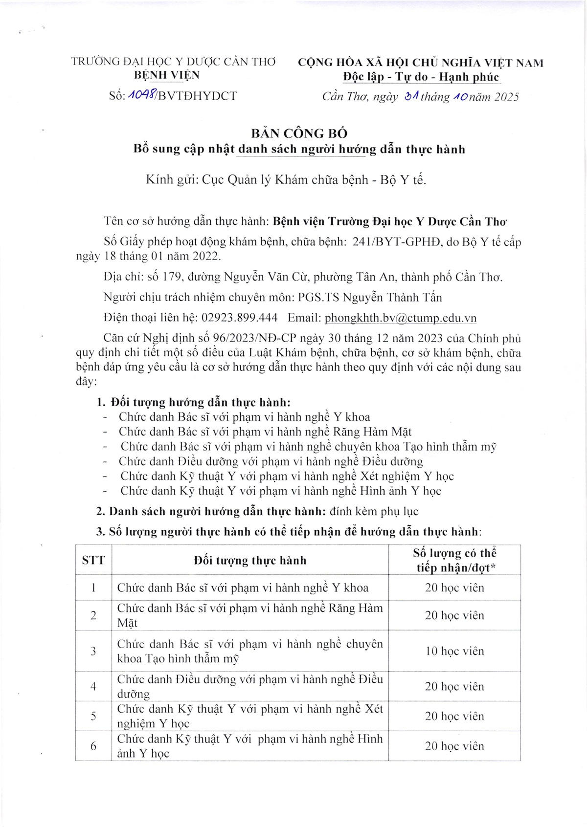 Bản công bố Bổ sung cập nhật danh sách người hướng dẫn thực hành