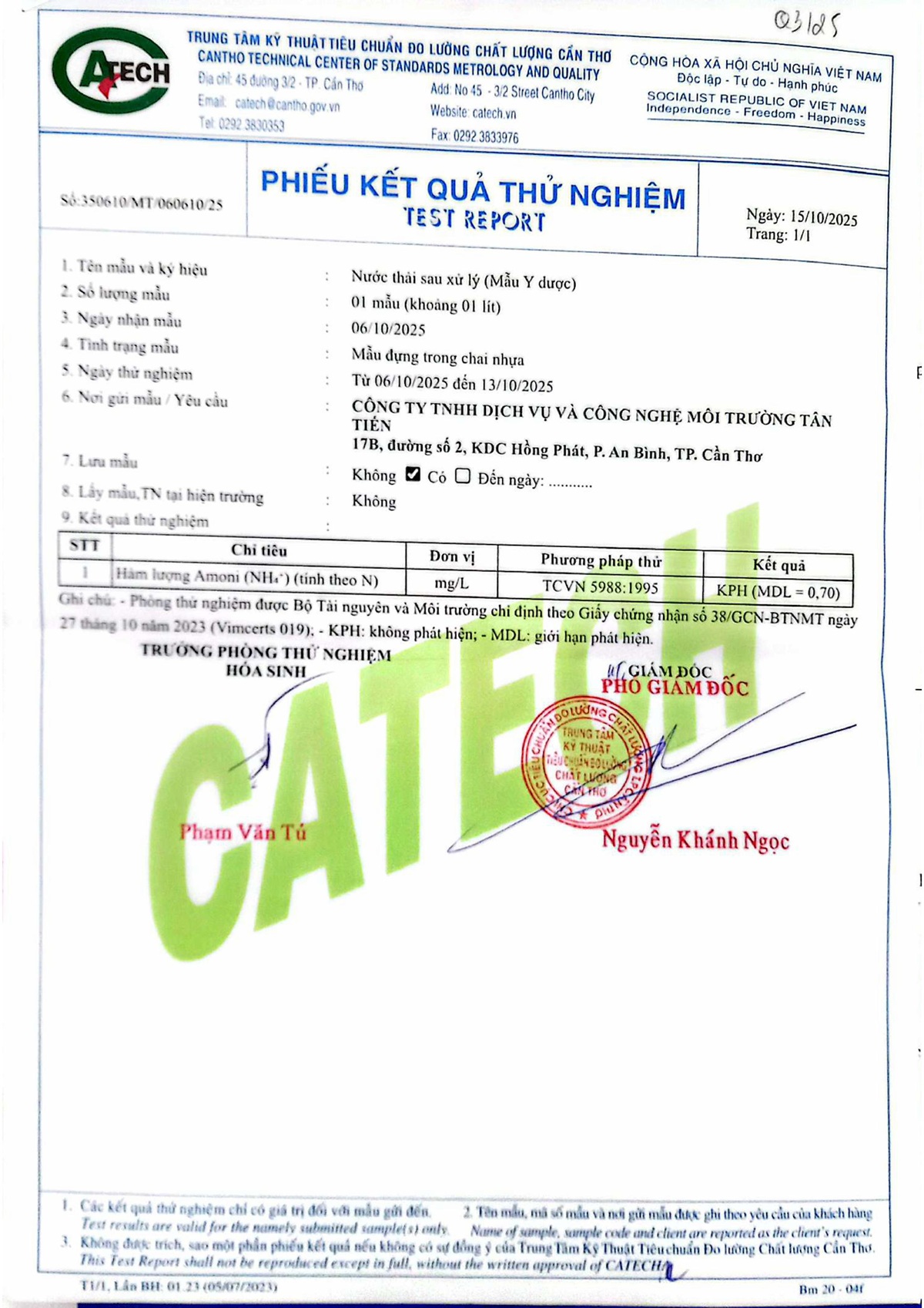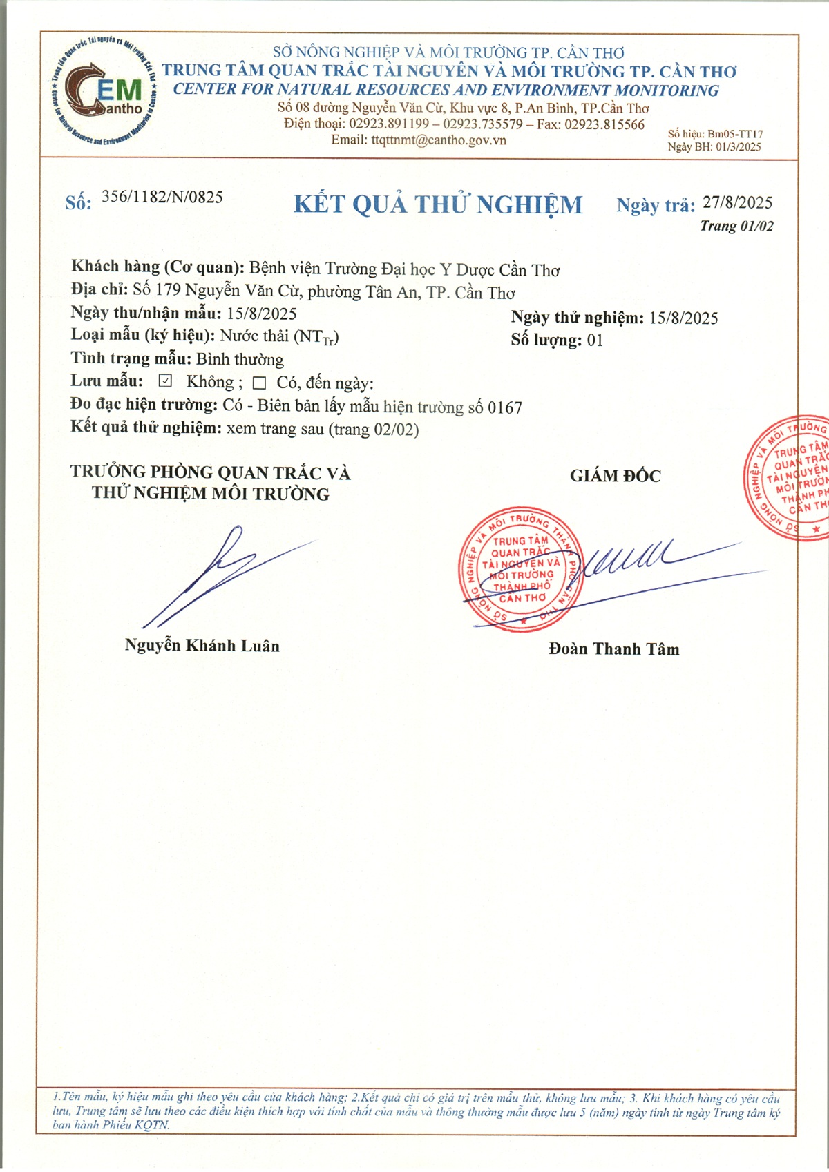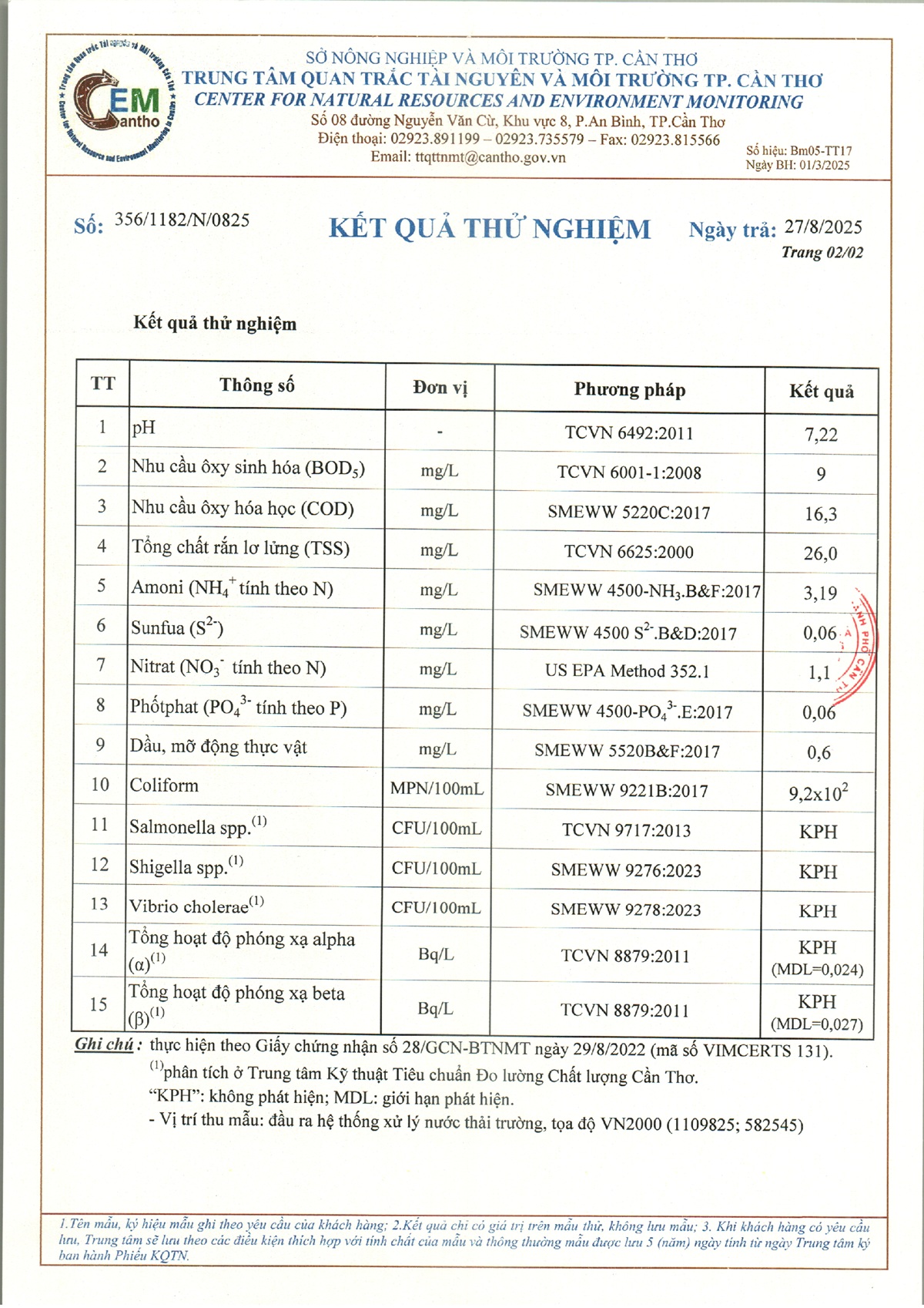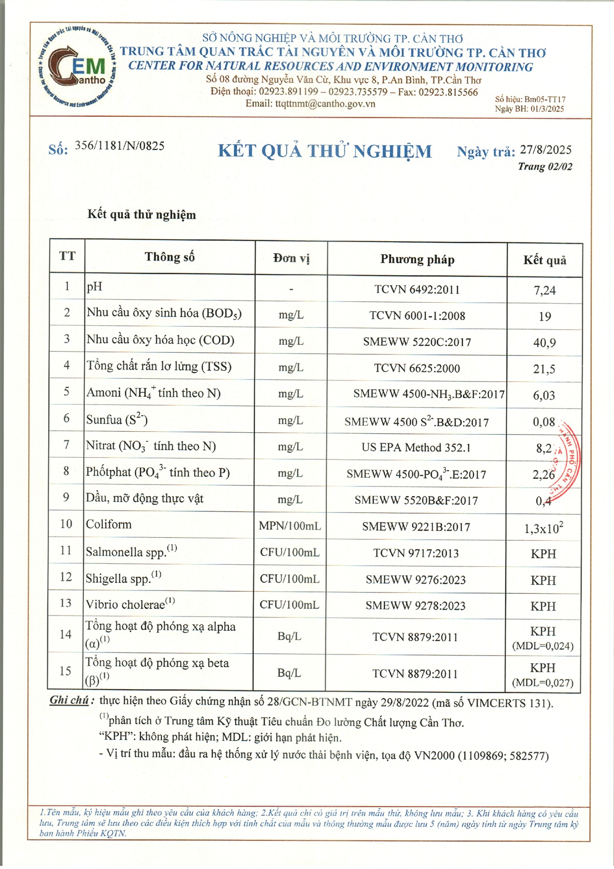 Kết quả quan trắc nước thải quý 3 năm 2025 của Bệnh viện Trường Đại học Y Dược Cần Thơ