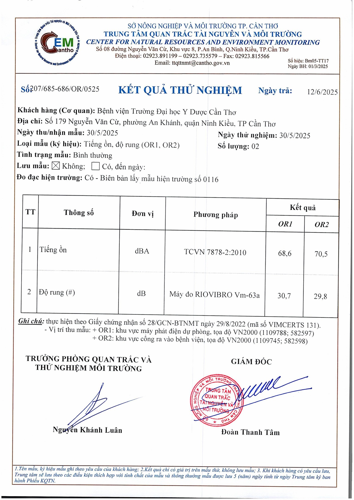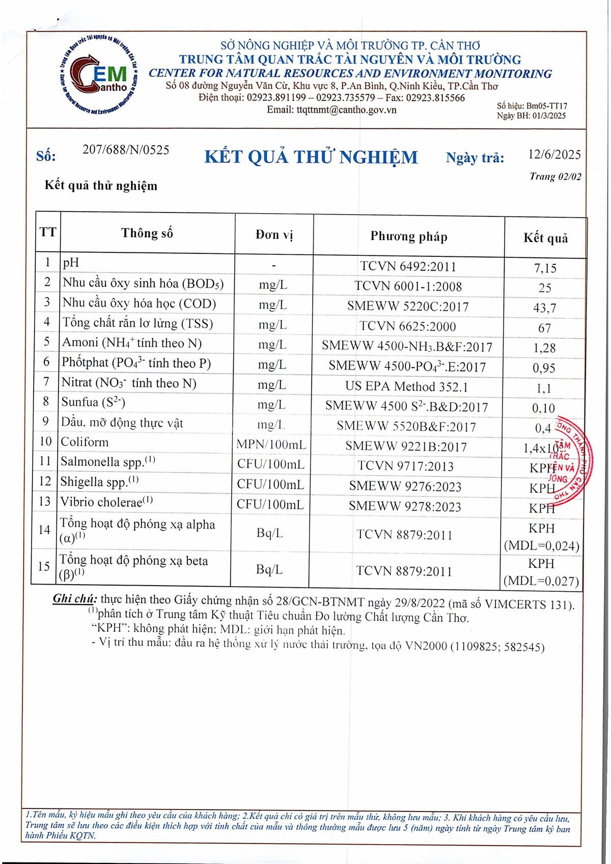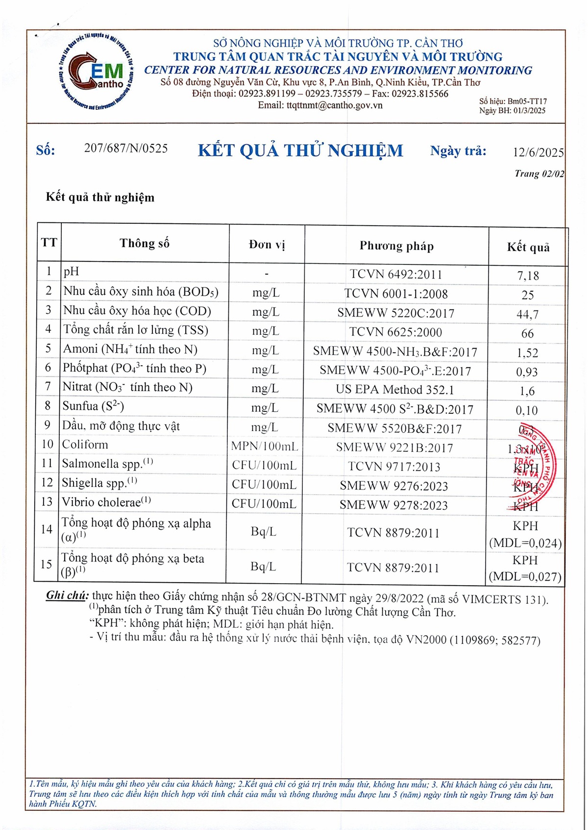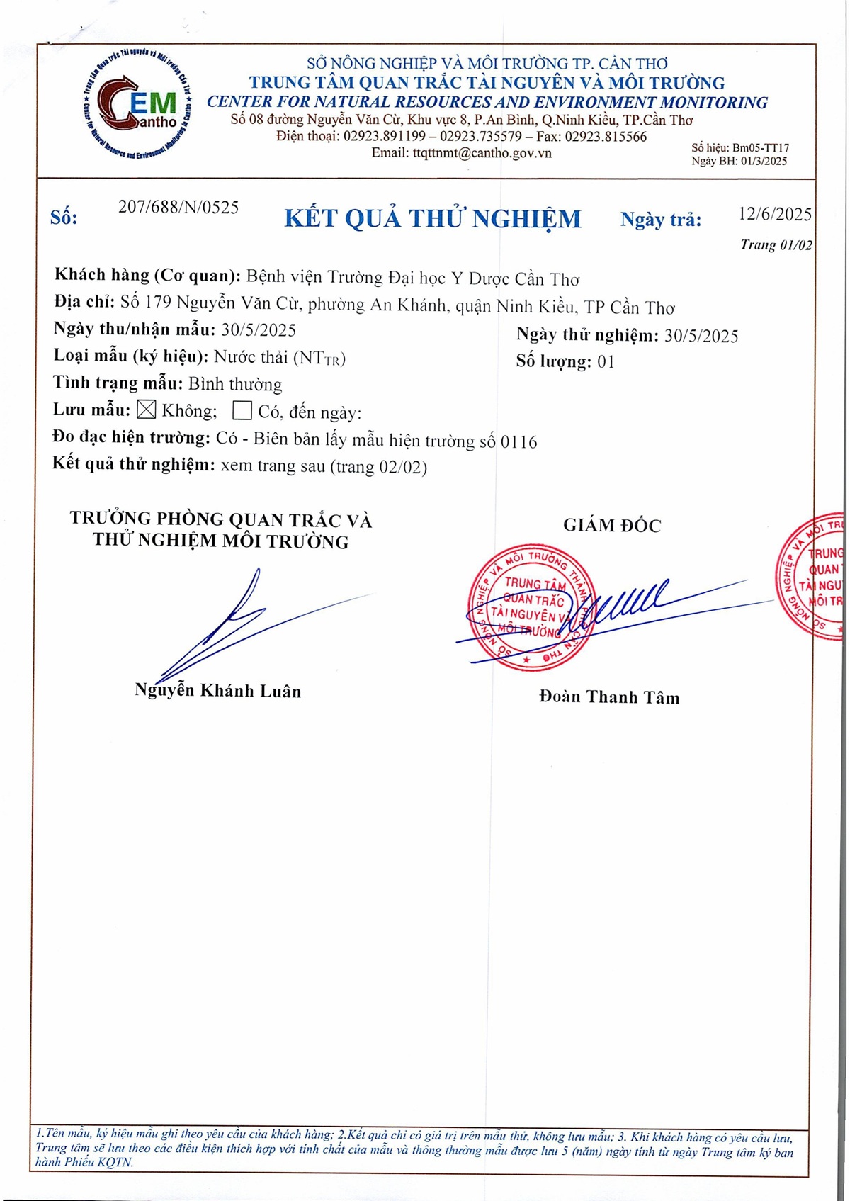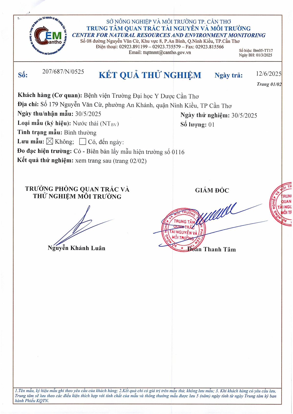Kết quả quan trắc nước thải quý 2 năm 2025 của Bệnh viện Trường Đại học Y Dược Cần Thơ.