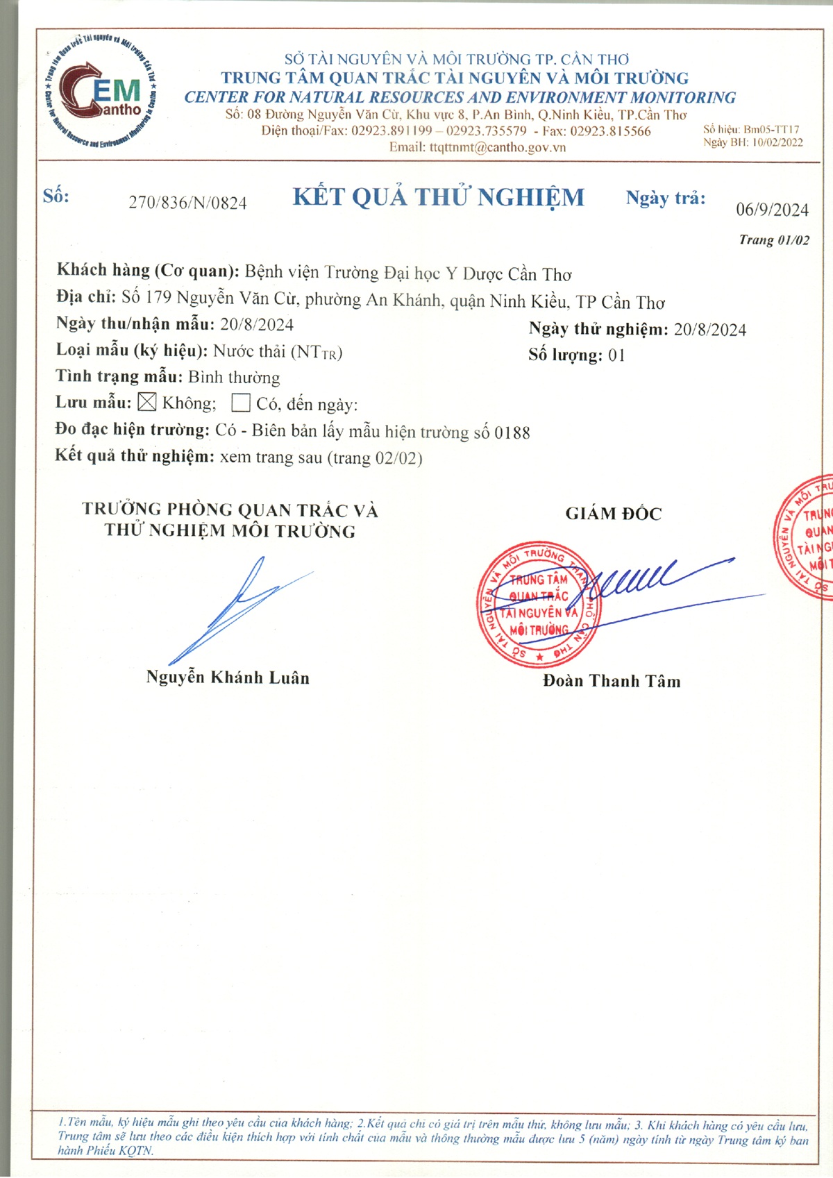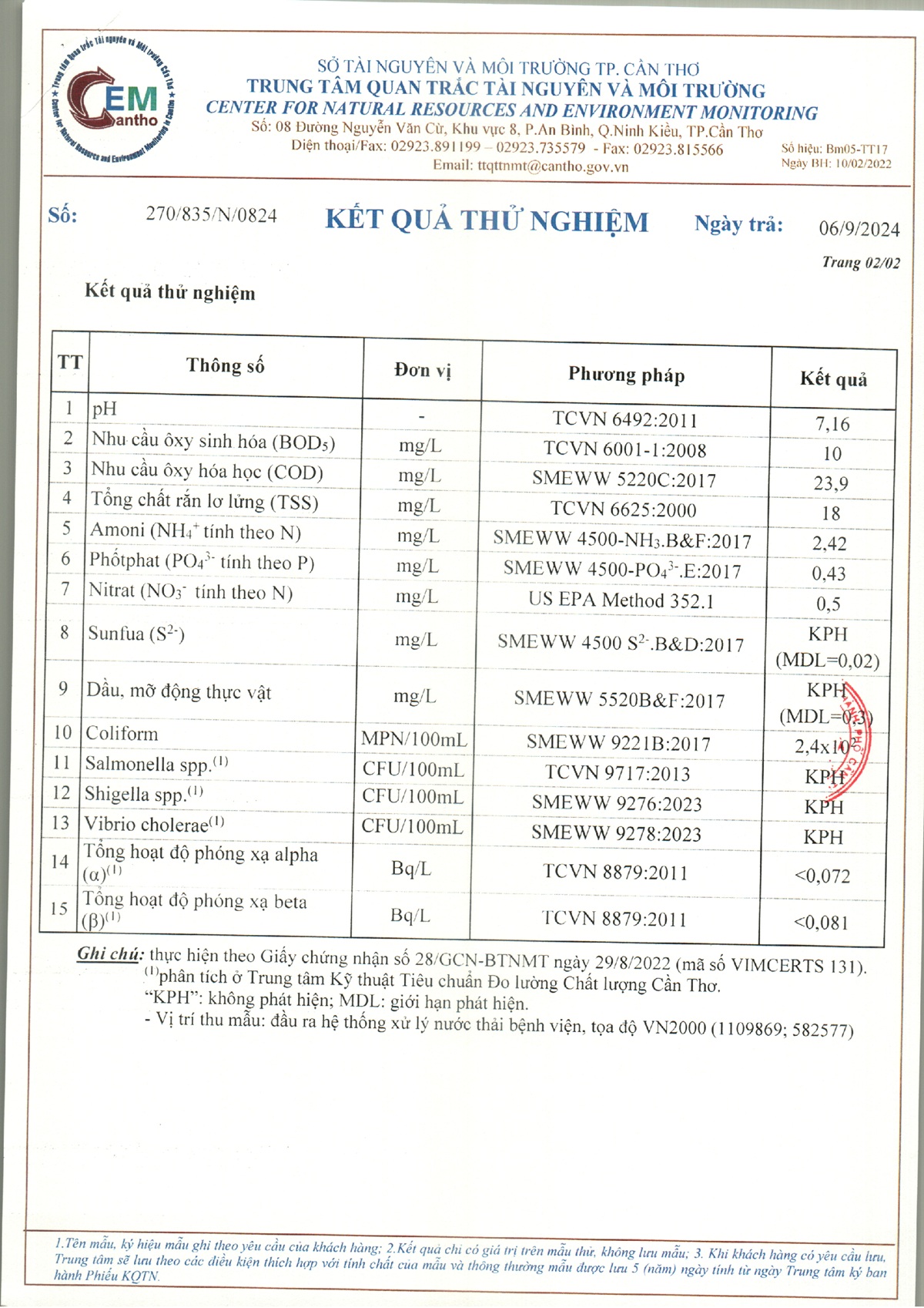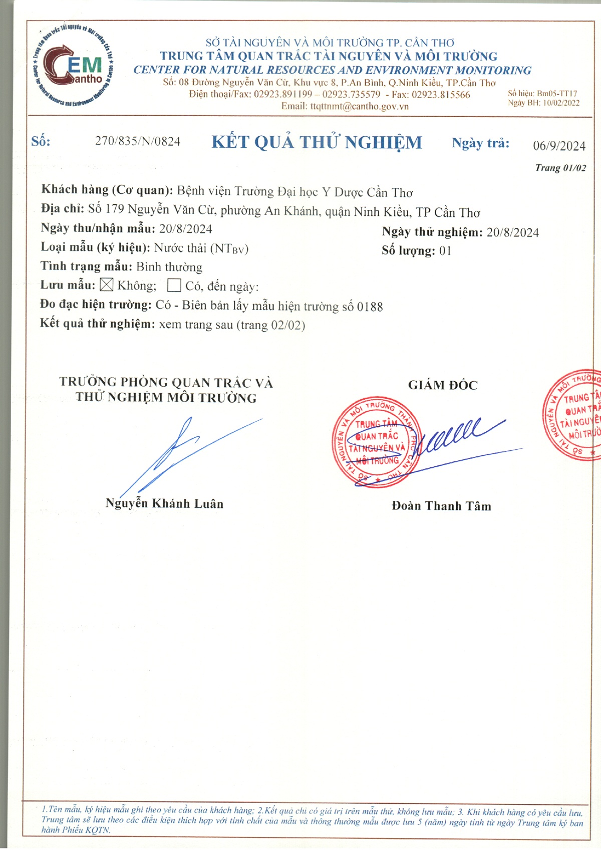 Kết quả quan trắc nước thải quý 3 năm 2024 của Bệnh viện Trường Đại học Y Dược Cần Thơ