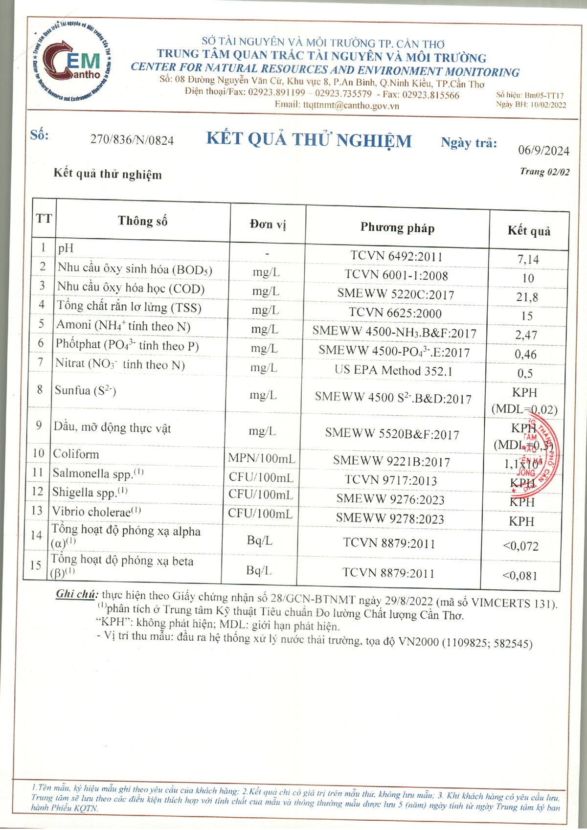 Kết quả quan trắc nước thải quý 2 năm 2024 của Bệnh viện Trường Đại học Y Dược Cần Thơ