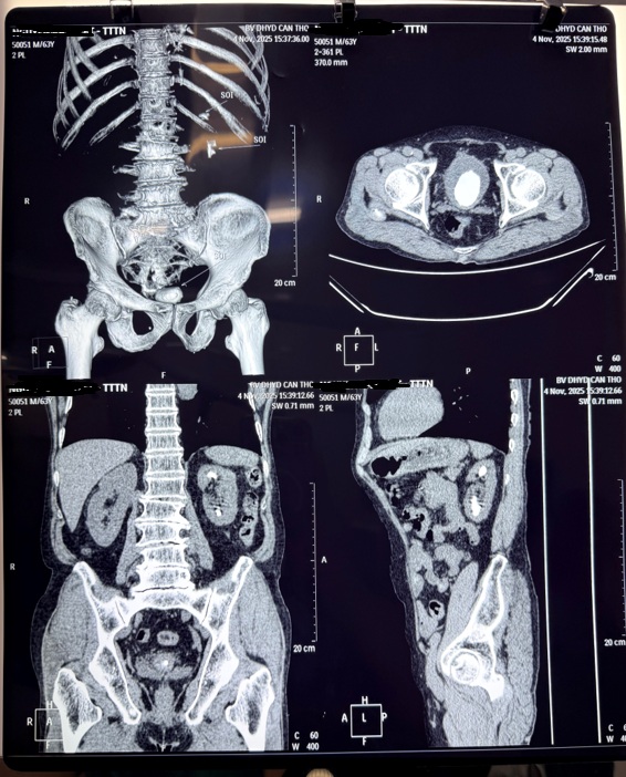 Vừa qua, Bệnh viện Trường Đại học Y Dược Cần Thơ đã tiếp nhận một trường hợp bệnh nhân nam 63 tuổi nhập viện với triệu chứng đau hạ vị, tiểu rất khó, tiểu buốt kéo dài, tiểu ngắt quãng và tiểu máu. Sau khi chụp cắt lớp vi tính ghi nhận bệnh nhân có một viên sỏi kích thước lớn với kt 46x35x31mm, chiếm gần toàn bộ lòng bàng quang, gây bế tắc dòng tiểu, nguy cơ bí tiểu và nhiễm trùng.