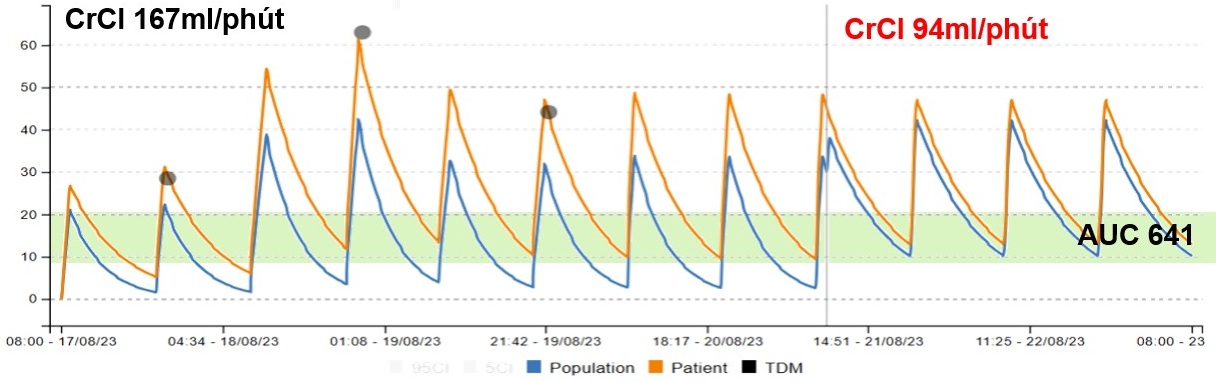 Dựa trên kết quả ước tính AUC, mức liều 2g mỗi 12 giờ được BS và DLS áp dụng cho người bệnh. Tuy nhiên việc theo dõi nồng độ và chức năng thận tiếp tục được thực hiện theo quy trình TDM.