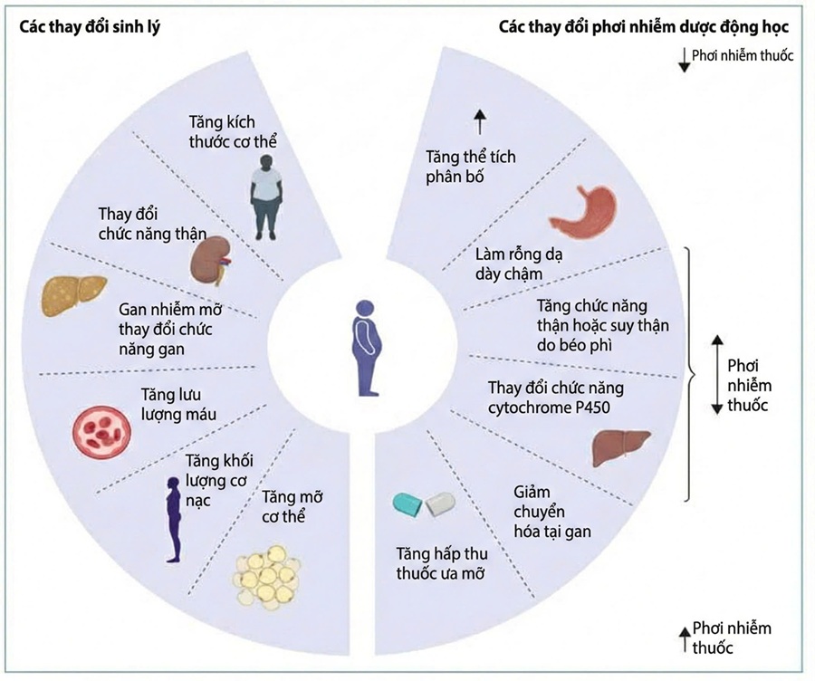 Hình 17.4. Các yếu tố sinh lý ảnh hưởng đến dược động học kháng sinh ở người béo phì (nguồn: tạp chí Lancet)