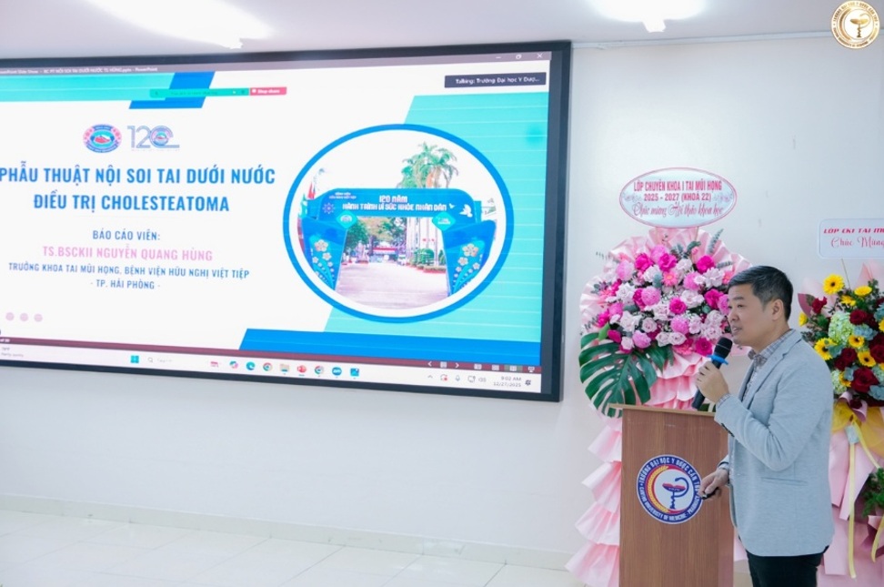 TS.BS. Nguyễn Quang Hùng – Trưởng Khoa TMH, Bệnh viện Việt - Tiệp Hải Phòng báo cáo về: “Ứng dụng Kỹ thuật phẫu thuật nội soi tai trong tiệt căn xương chũm và chỉnh hình xương con”