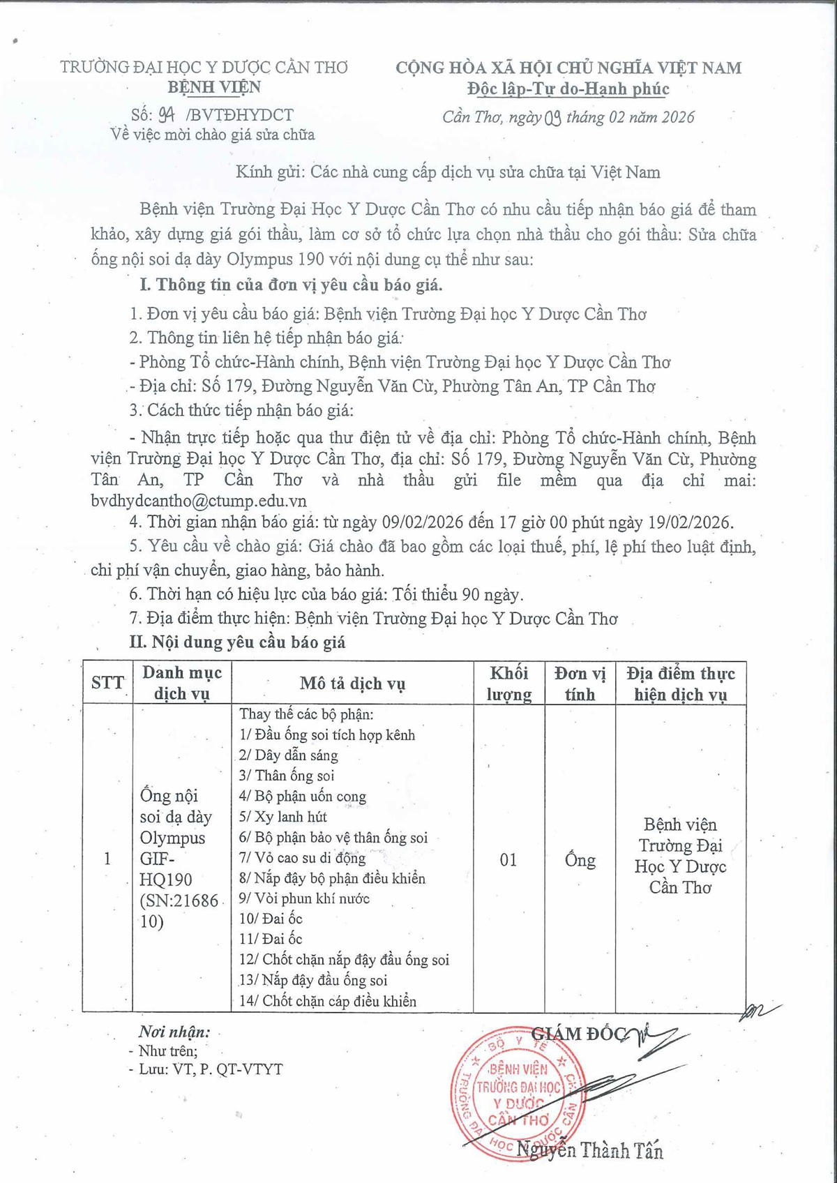 Về việc mời chào giá Sửa chữa ống nội soi dạ dày Olympus 190