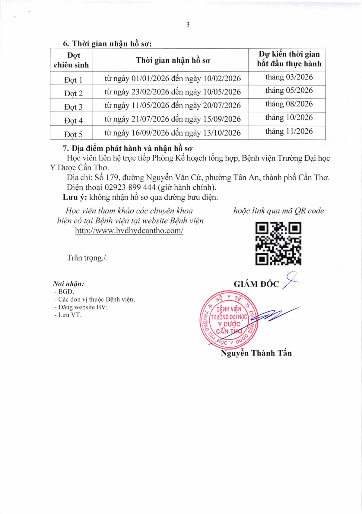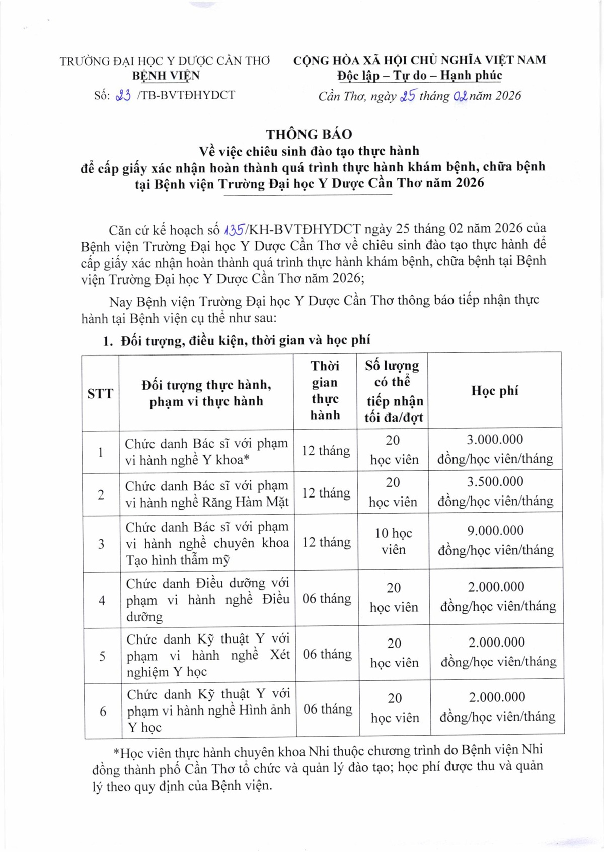 Thông báo số 23 về việc chiêu sinh đào tạo thực hành để cấp giấy xác nhận hoàn thành quá trình thực hành khám bệnh, chữa bệnh tại Bệnh viện Trường Đại học Y Dược Cần Thơ năm 2026