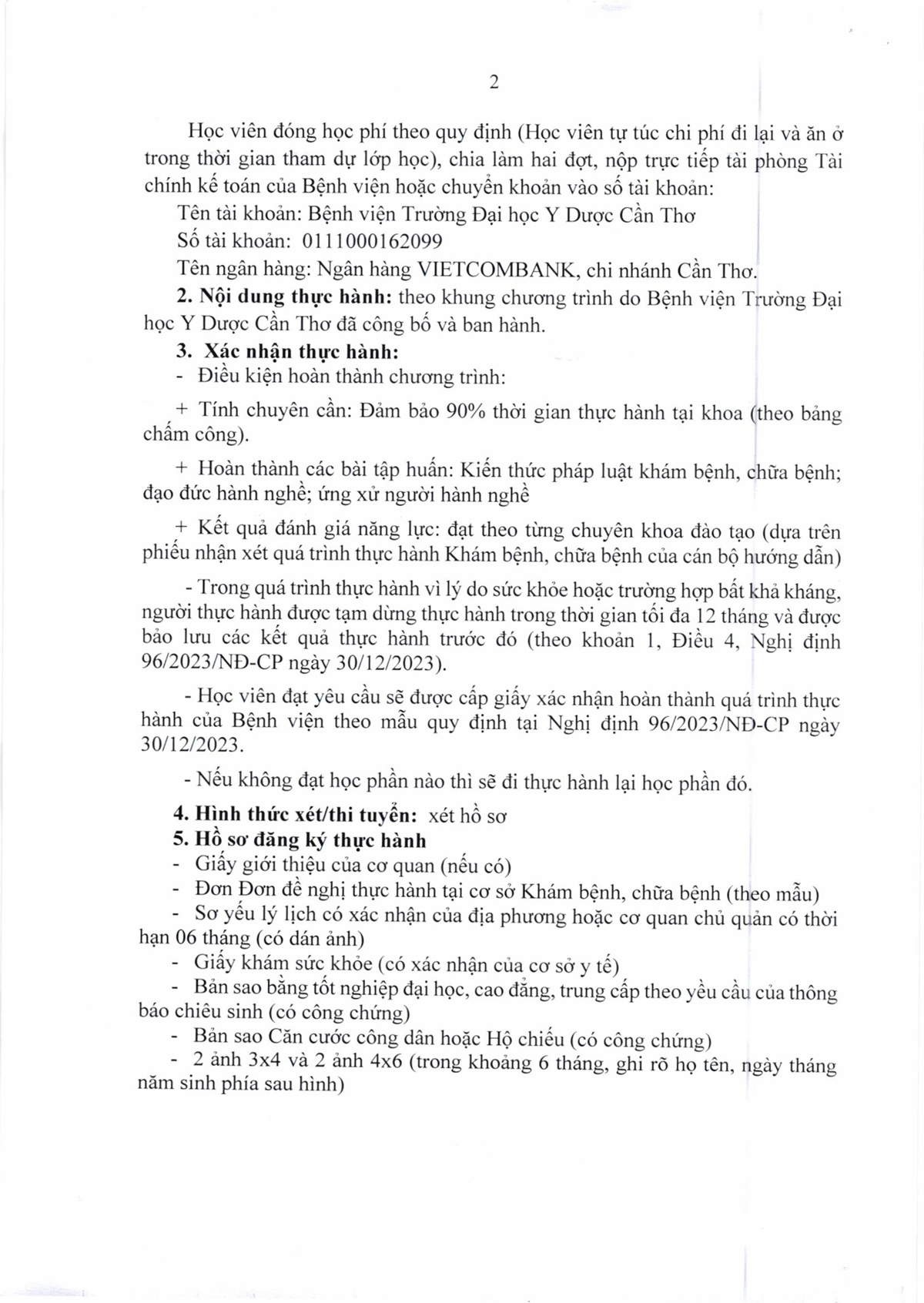Thông báo số 23 về việc chiêu sinh đào tạo thực hành để cấp giấy xác nhận hoàn thành quá trình thực hành khám bệnh, chữa bệnh tại Bệnh viện Trường Đại học Y Dược Cần Thơ năm 2026.