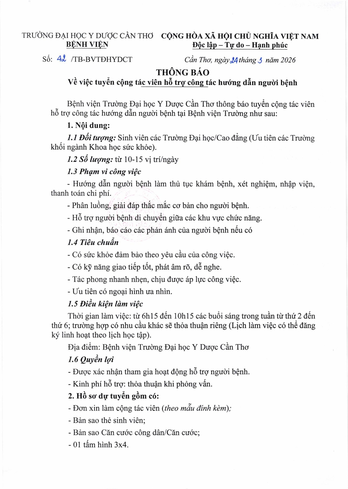 Thông báo số 42 về việc tuyển cộng tác viên hỗ trợ công tác hướng dẫn người bệnh.