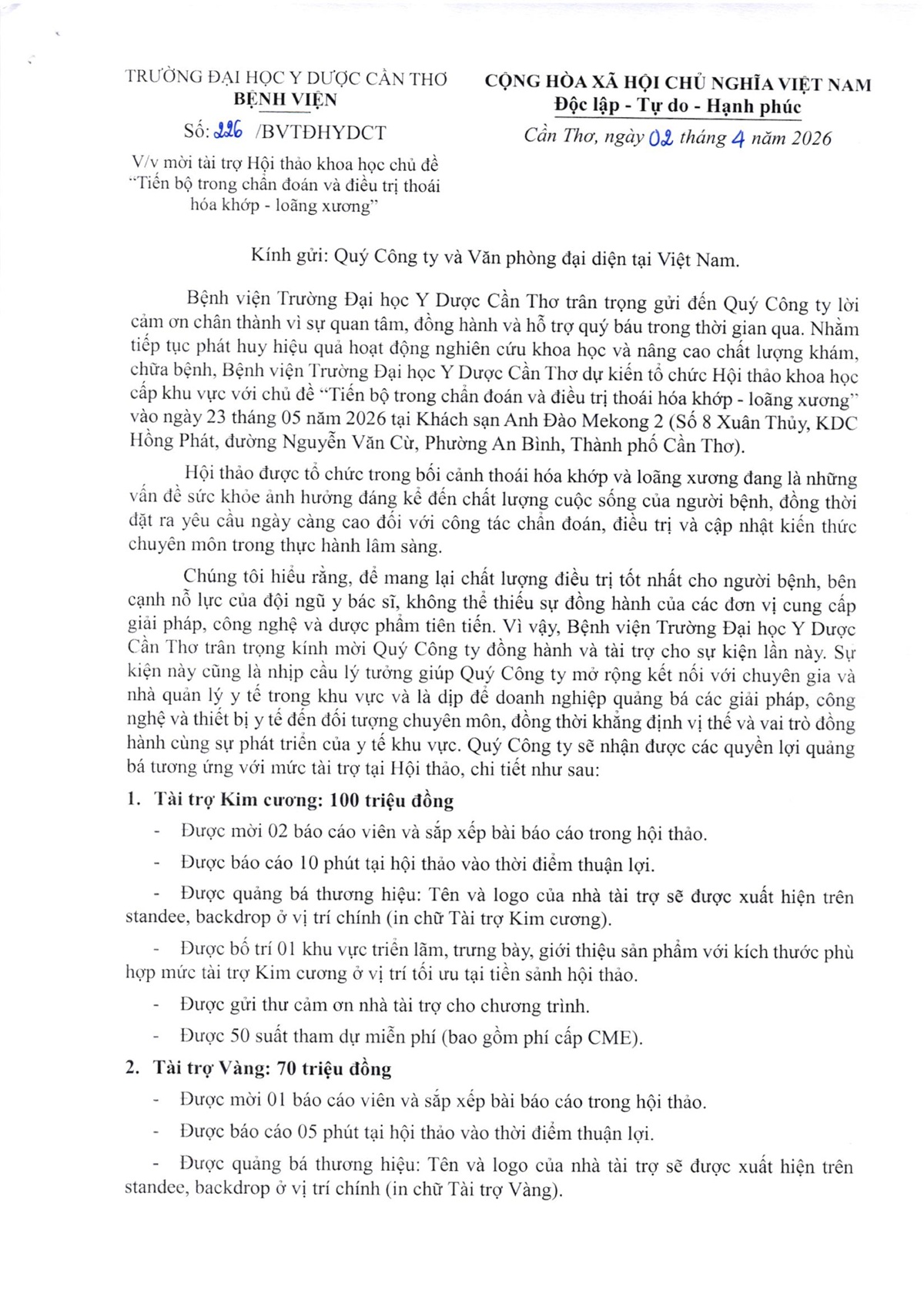 Công văn số 226 về việc mời tài trợ Hội thảo khoa học chủ đề "Tiến bộ trong chẩn đoán và điều trị thoái hóa khớp - loãng xương"