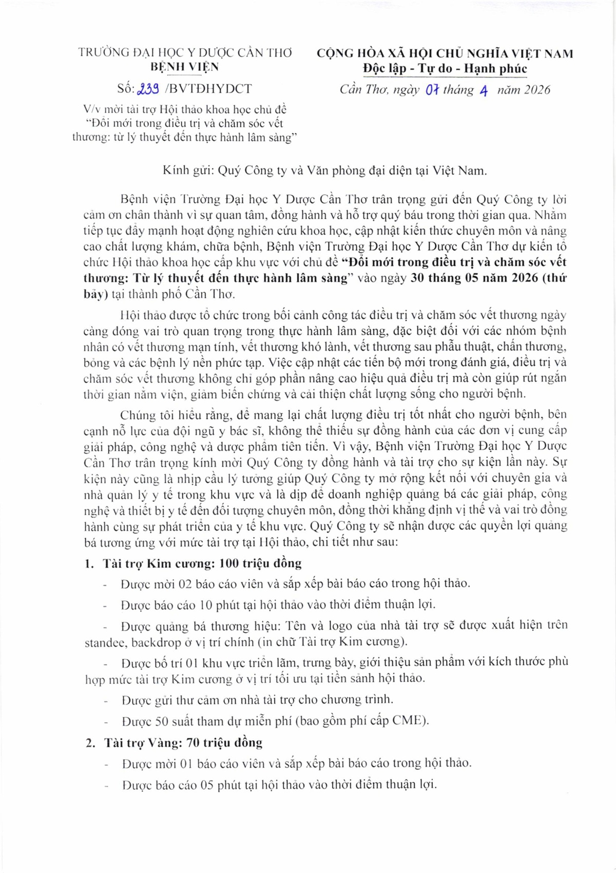 Công văn số 239 V/v mời tài trợ Hội thảo khoa học chủ đề "Đổi mới trong điều trị và chăm sóc vết thương: từ lý thuyết đến thực hành lâm sàng".