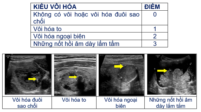 Khi đánh giá đủ 5 tính chất đặc điểm hình ảnh nhân giáp nêu trên, tính điểm tổng của 5 tính chất đó và phân loại TIRADS theo ACR như sau: