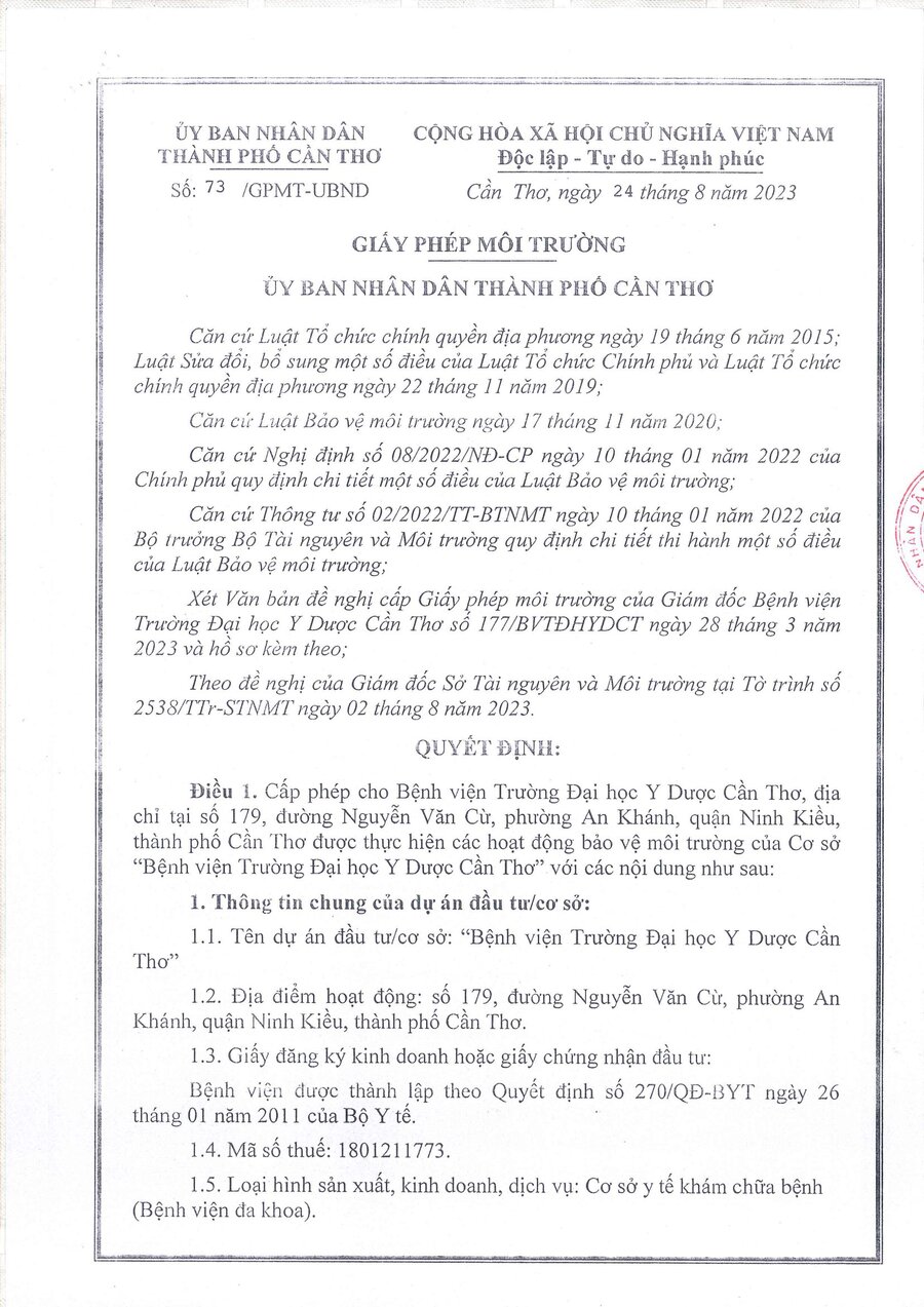 Giấy phép môi trường cấp phép cho Bệnh viện Trường Đại học Y Dược Cần Thơ
