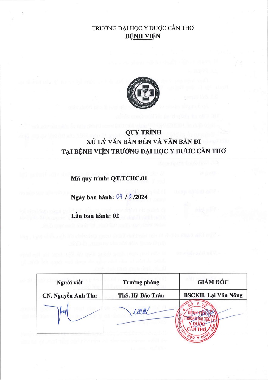 Quyết định số 139/QĐ-BVTĐHYDCT về việc Cập nhật Quy trình xử lý văn bản hành chính tại Bệnh viện Trường Đại học Y Dược Cần Thơ.