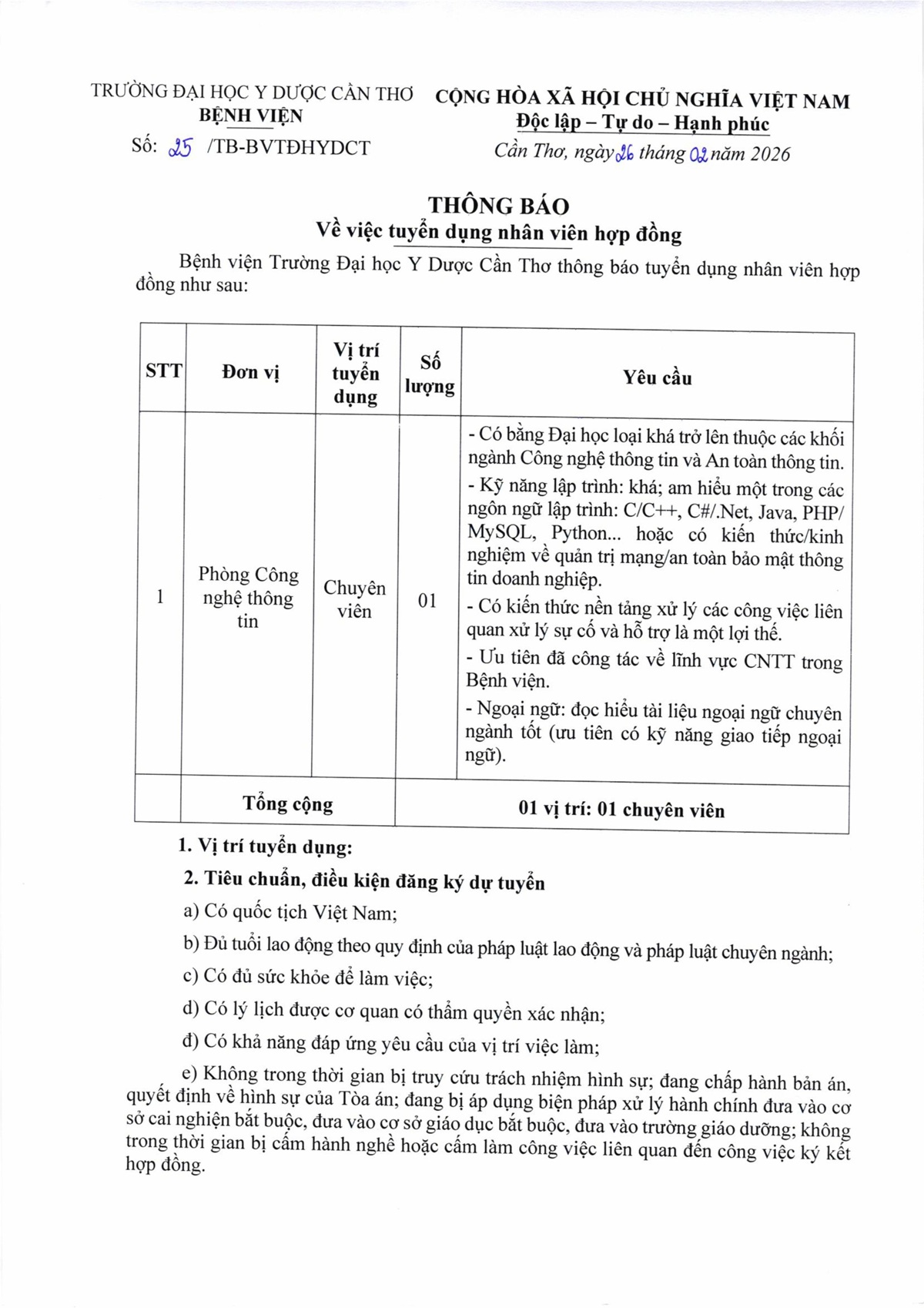 Thông báo số 01 Kết quả tuyển dụng viên chức đợt 2 năm 2025 của Bệnh viện Trường Đại học Y Dược Cần Thơ